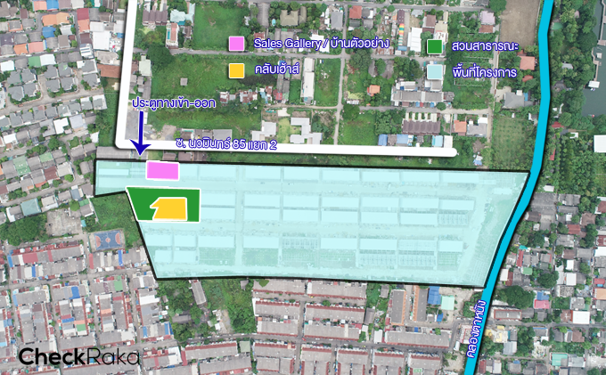 แสดงให้เห็นถึงขอบเขตโครงการโดยรวม ที่ตั้งของบ้าน สำนักงานขาย สวนสาธารณะ คลับเฮ้าส์ และทางเข้า-ออก