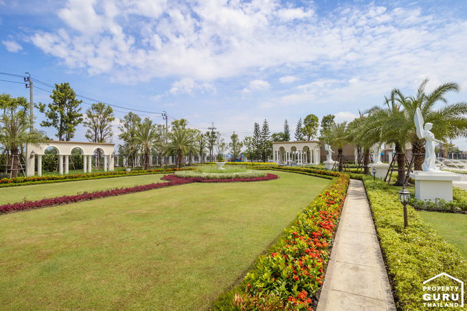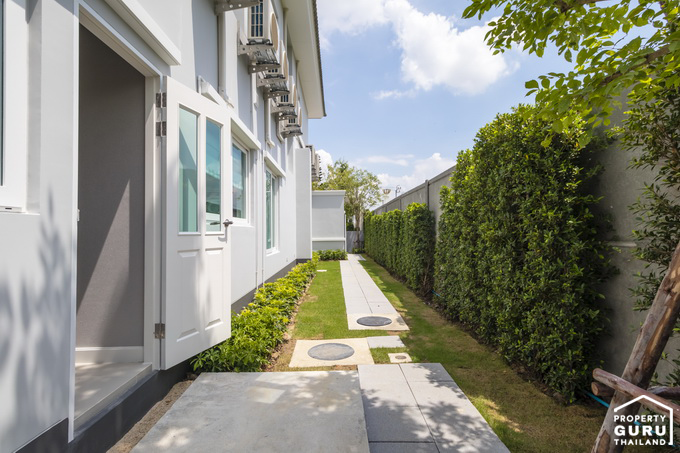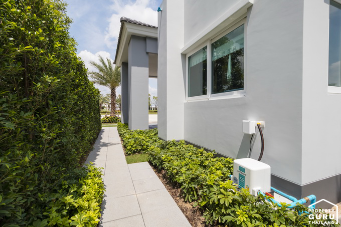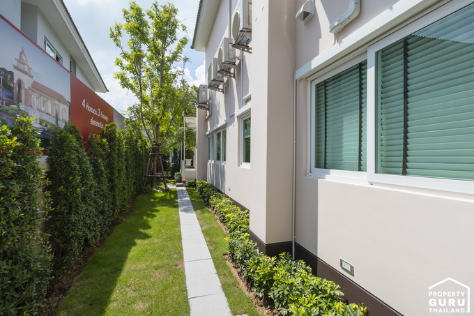 บ้านทุกหลังจะมีพื้นที่ด้านข้างๆ บ้านมากน้อยไม่เท่ากัน แล้วแต่พื้นที่จัดสรร ทางโครงการจัดสวนปูหญ้ามาให้ ลงไม้ใหญ่ให้เฉพาะหลังมุม อาจจะไม่ได้รูปแบบสวนตามบ้านตัวอย่าง ซึ่งจะแล้วแต่การดีไซน์ของทางโครงการ
