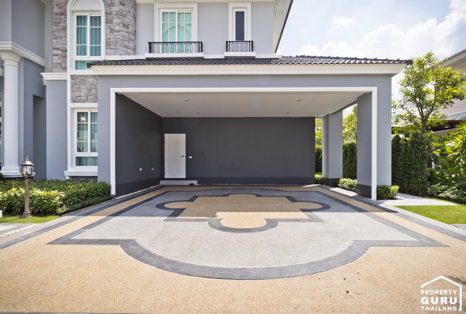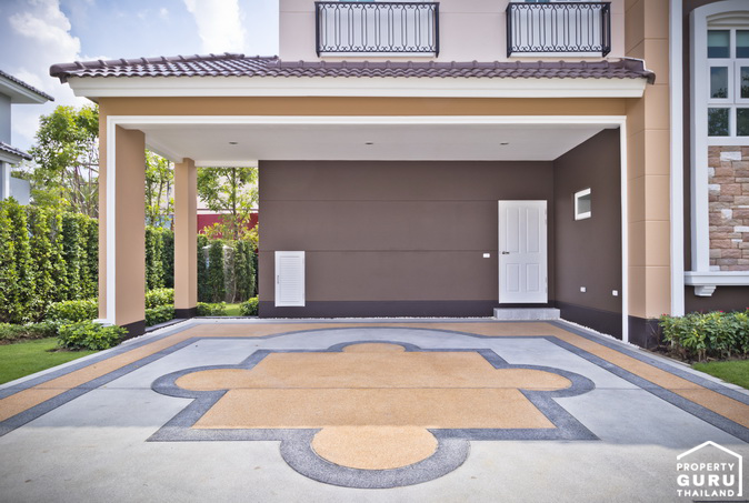 ที่จอดรถของบ้านหลังนี้สามารถจอดรถได้ 3 คัน พื้นที่จอดรถเป็นพื้นซีเมนต์ On Ground ขัดหยาบ