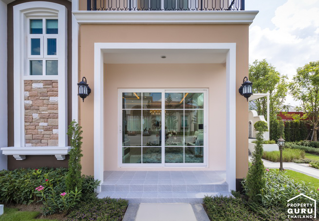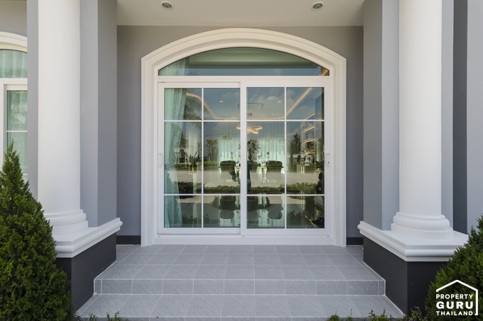 ประตูทางเข้าหน้าบ้าน เป็นประตูบานเลื่อนคู่ เฉลียงหน้าบ้านปูด้วยกระเบื้อง ยกสเต็ปขึ้นให้