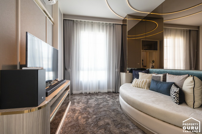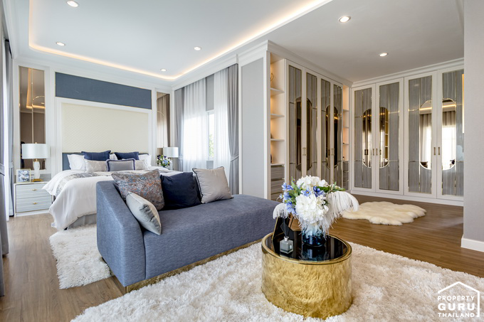 พื้นที่ปลายเตียงสามารถจัดเป็นส่วนพักผ่อน วางโซฟา ดูทีวีได้สบาย เพราะกว้างมาก