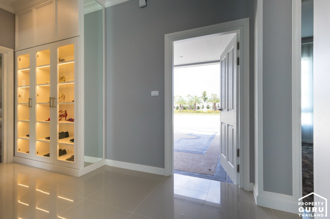 ถัดจากห้องนอนชั้นล่างเป็นประตูที่สามารถเปิดออกไปลานจอดรถ พื้นที่ข้างๆ ประตูจะ Built-in เป็นตู้รองเท้าแบบนี้ก็ดีเลย