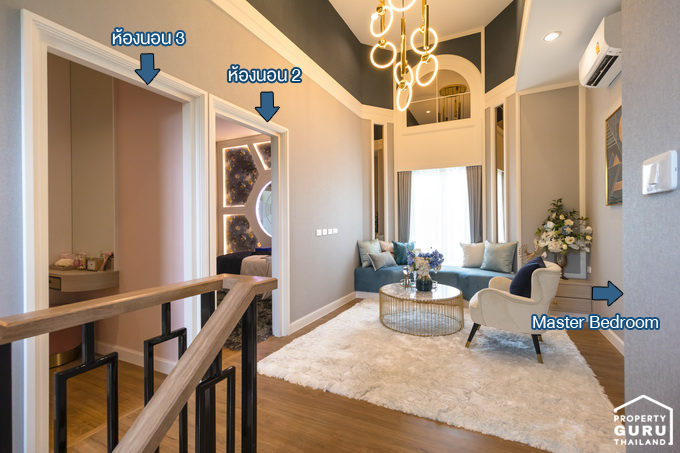 Master Bedroom ห้องนี้มีขนาดใหญ่สุด และกินพื้นที่เกือบฝั่งหนึ่งของชั้นนี้เลยค่ะ เปิดเข้ามาจะเห็นพื้นที่สำหรับทำ Walk-in Closet และห้องน้ำในตัวแบบนี้