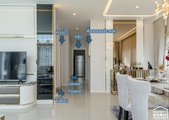 ถัดจากห้องอเนกประสงค์ คือ ทางเข้าห้องครัว ซึ่งเป็นครัวแยก ทางโครงการติดตั้งประตูมาให้ช่วยลดปัญหาเรื่องกลิ่นควันเข้าตัวบ้าน วางตู้เย็นได้ที่มุมนี้