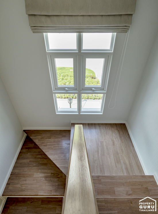 ตรงชานพักจะมีกระจก และหน้าต่างบานกระทุ้งเปิดรับแสงและระบายอากาศช่วงบันไดได้