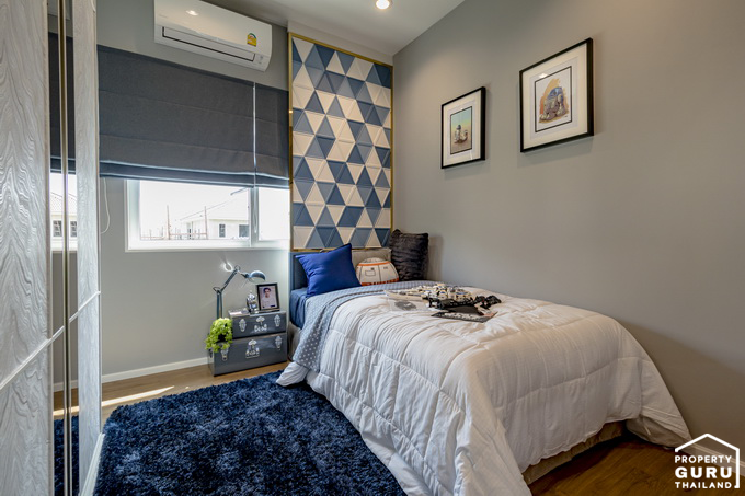 ห้องนอน 2 วางตัวอยู่ฝั่งหน้าบ้าน เหมาะจะทำเป็นห้องนอนคุณลูก วางเตียงขนาดเล็กได้พอดี ภายในห้องมีหน้าต่างบานเลื่อน 1 บาน และบานกระทุ้ง 1 บาน