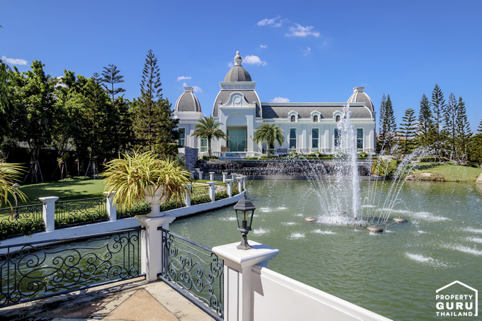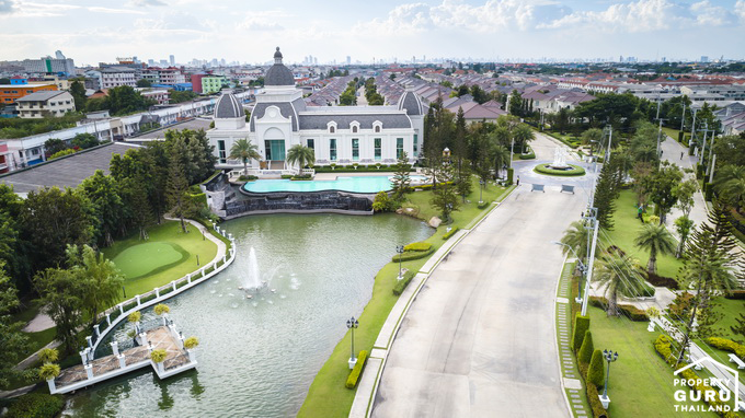 ภาพมุมสูงแสดงให้เห็นอาคารคลับเฮ้าส์ขนาดใหญ่ ด้านหน้ามีทะเลสาบขนาดย่อม และมีสวนสีเขียวโดยรอบ