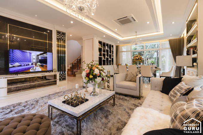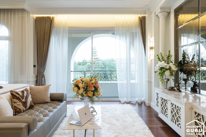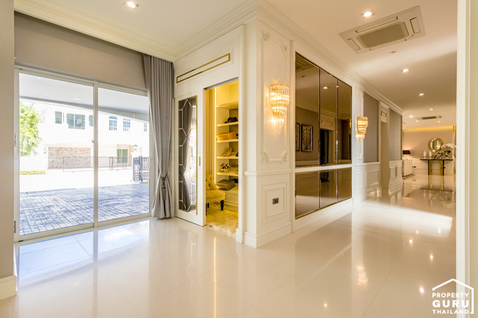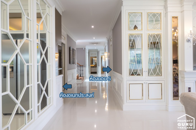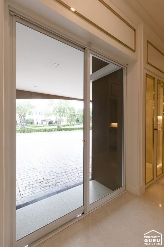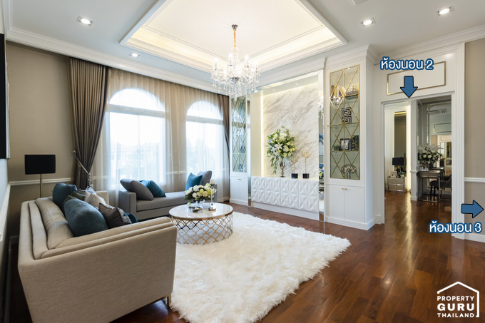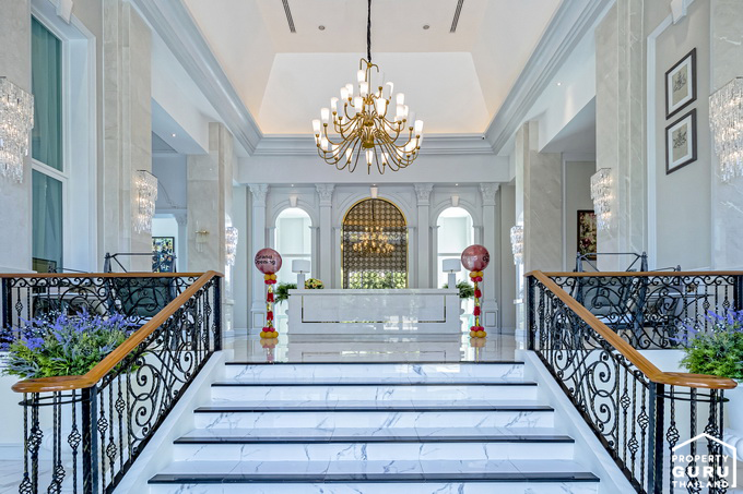 เข้ามาด้านในจะเจอกับโถงต้อนรับขนาดใหญ่ ปูพื้นด้วยกระเบื้องลายหินอ่อนสีขาว ฝ้าเพดานสูงแบบ Double Volume สวยงามและหรูหรามากทีเดียวค่ะ