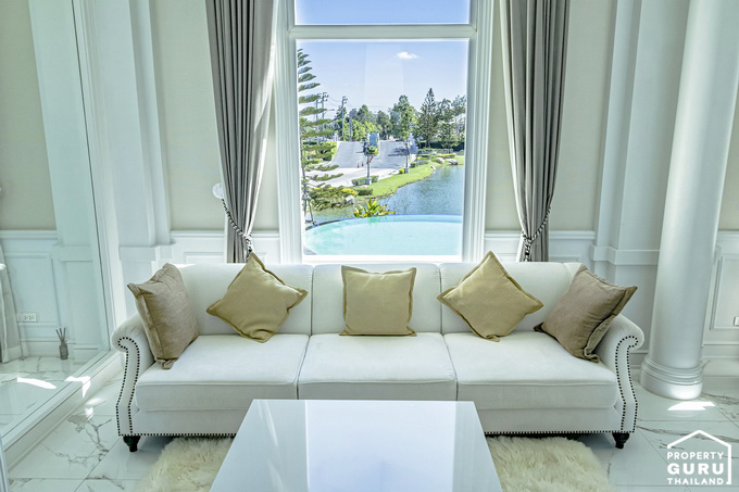 จากโซฟาจะมองเห็นวิวสระว่ายน้ำ และทะเลสาบด้านนอก