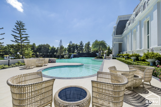 รอบสระจัดชุดโต๊ะเก้าอี้หวายไว้นั่งพักผ่อนริมสระให้ และมีมุม Jacuzzi ไว้นั่งนวดตัว