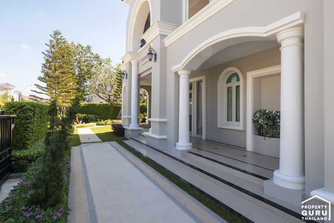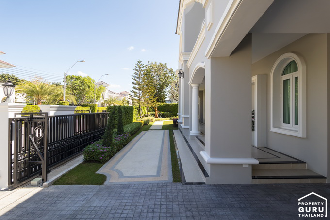 บ้าน Versailles (แวร์ซายน์) หลังนี้เป็นบ้านที่ขายจริงพร้อมตกแต่งให้ลูกค้าทั้งหลังเลยค่ะ จะเห็นรั้วหน้าบ้านเป็นรั้วเหล็ก