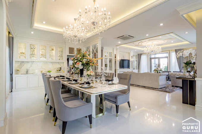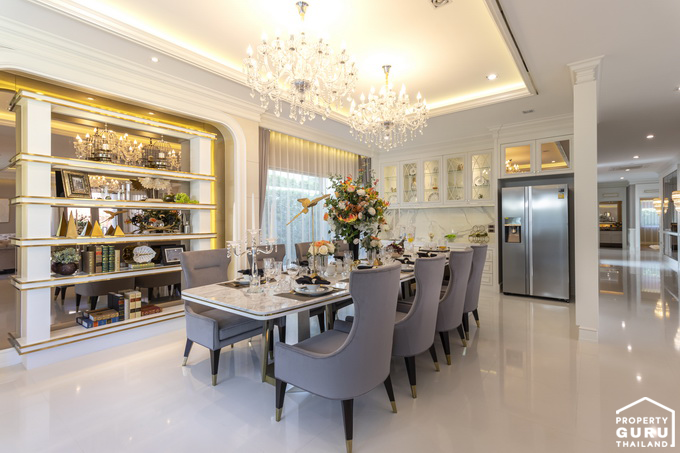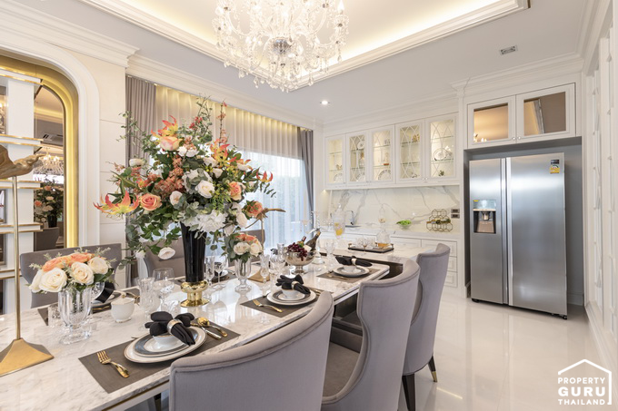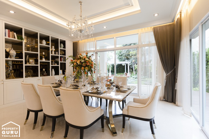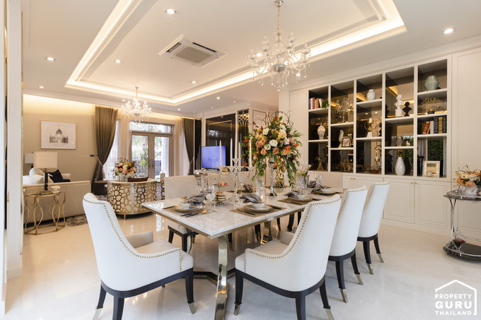 วางโต๊ะอาหารขนาด 6-8 ที่ได้พอดี ส่วนตรงผนังสามารถจัดเป็นตู้โชว์วางของ
