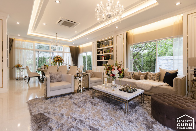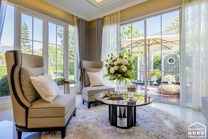 60 x 60 ซม. วางโซฟาชุดใหญ่ได้เต็มที่ มีหน้าต่างบานใหญ่อยู่ด้านหลังช่วยให้แสงธรรมชาติ เข้ามาในบ้านได้อย่างดี