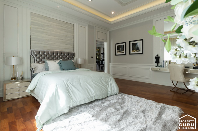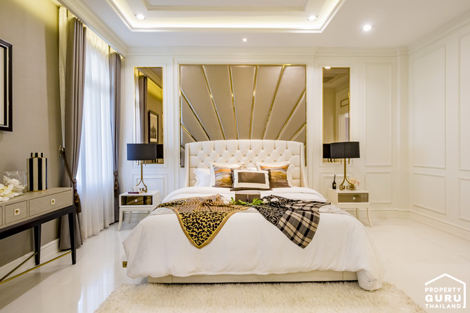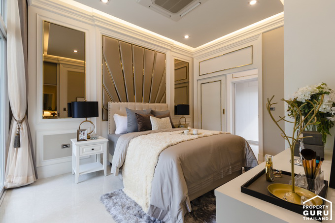 พื้นที่กว้างสามารถวางเตียงขนาดใหญ่และยังมีพื้นที่เหลือให้วางโต๊ะข้างเตียงได้อีกด้วย ปลายเตียงจัดวางโต๊ะวางทีวีแล้วยังเหลือระยะเดินอีกเยอะเลยทีเดียว