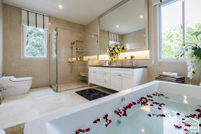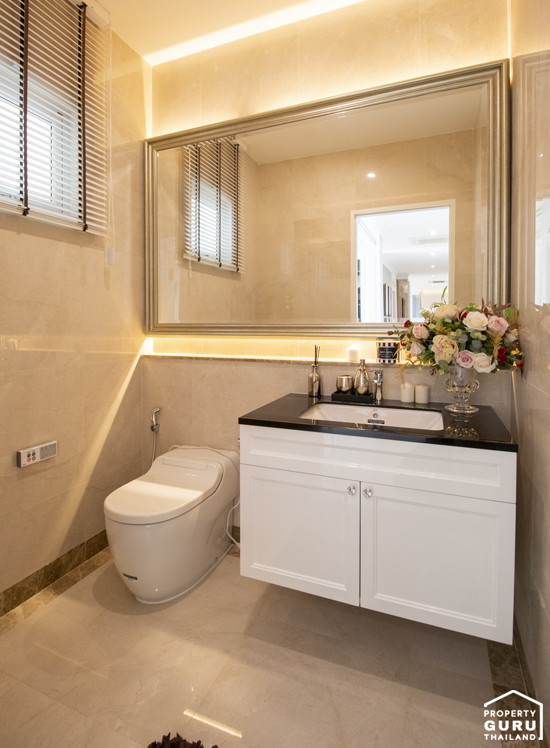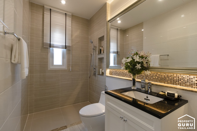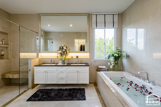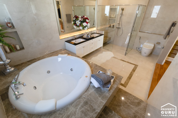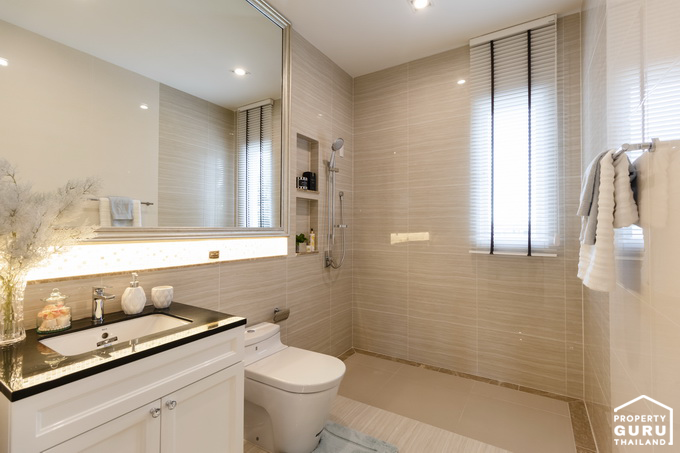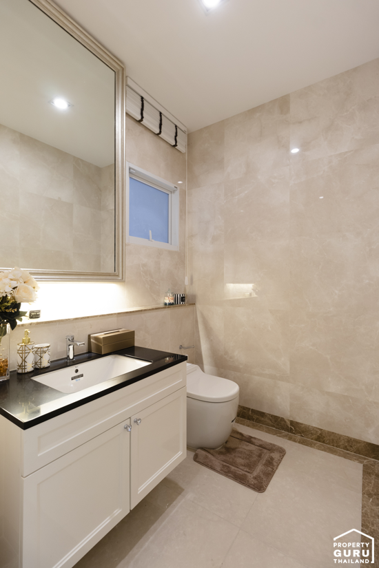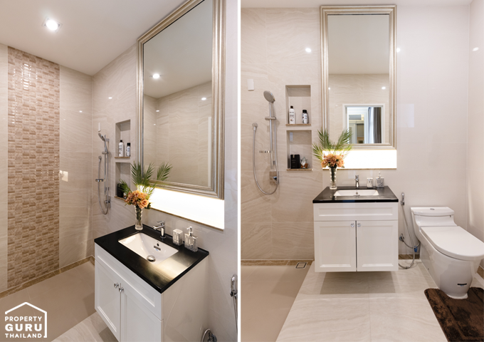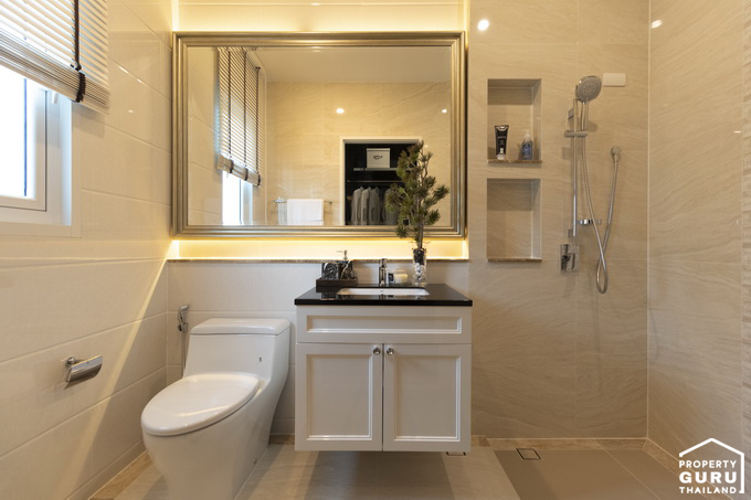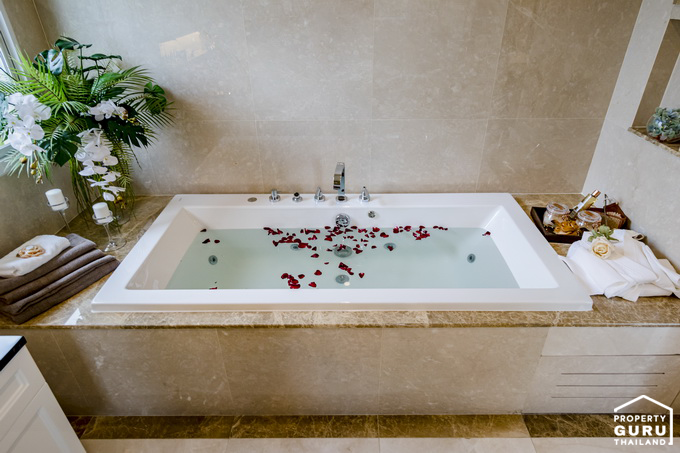 โถสุขภัณฑ์จะกั้นแยกส่วนกันกับห้องอาบน้ำที่เป็นกระจกเทมเปอร์ อ่างล้างหน้าแบบ His&Her และมีอ่างจากุซซี่ให้ด้วย