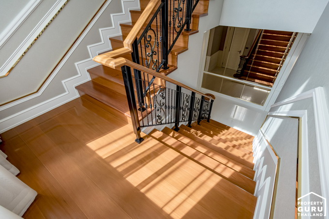 มีชานพักสี่เหลี่ยม ราวบันไดเป็นราวเหล็กดัดลวดลายสวยงาม มือจับราวบันไดใช้ไม้มะค่า