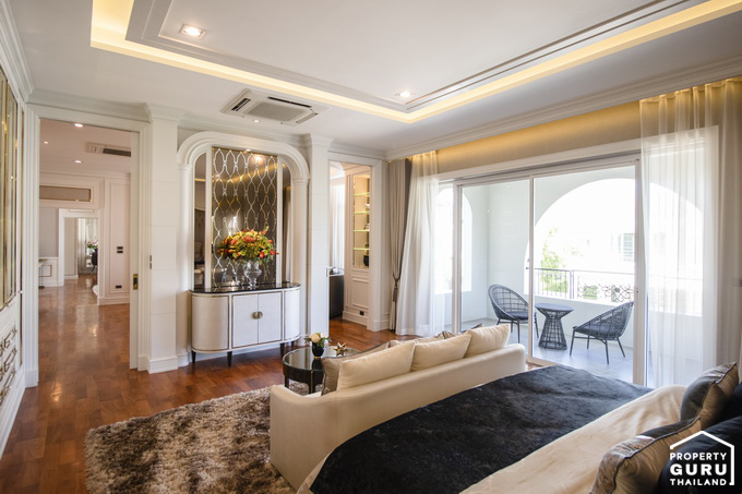 ถัดจากผนังกั้นจะเป็นส่วนของห้องนอน ถือว่าห้องนี้มีฟังก์ชันใช้งานที่ครบครันมาก ทั้งพื้นที่พักผ่อนด้านหน้า พื้นที่วางเตียงขนาดใหญ่ ประตูบานเลื่อน ระเบียง Walk-in Closet และห้องน้ำในตัว