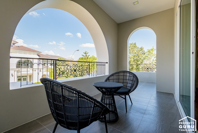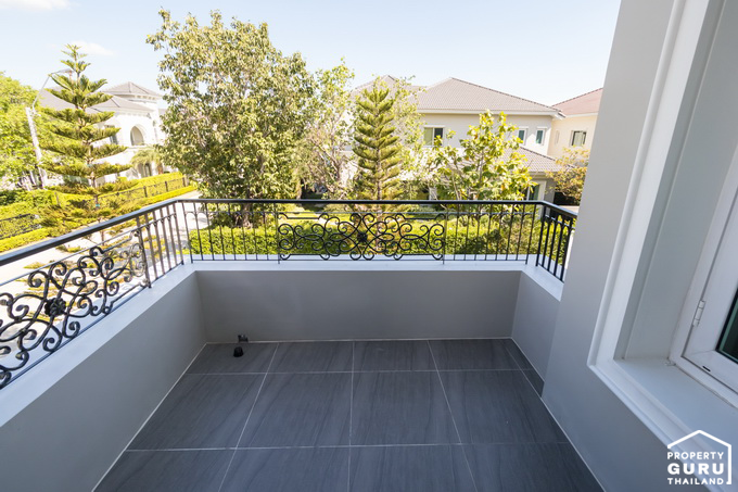 ระเบียงด้านนอกมีความยาวและกว้างมาก สามารถออกมาชมวิวด้านหน้าบ้าน หรือจะนำเก้าอี้มานั่งพักผ่อนในช่วงที่อากาศดีๆ แบบบ้านตัวอย่างนี้ก็ได้ค่ะ