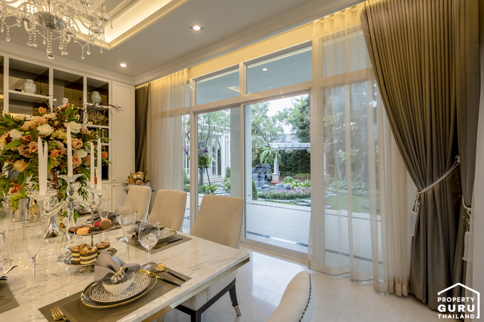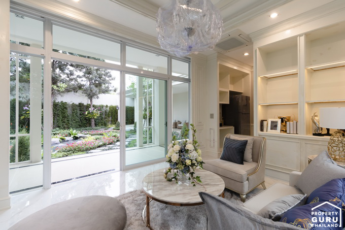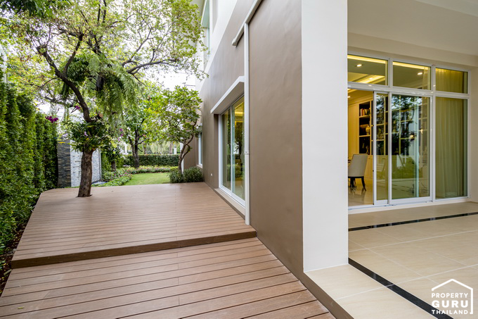 ประตูกระจกบานใหญ่สามารถมองเห็นวิวสวนด้านหลังที่ตกแต่งไว้ได้