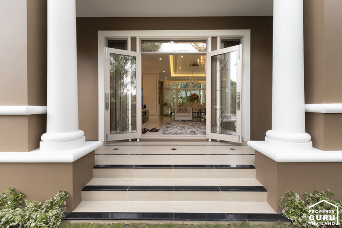 กลับมาดูประตูทางเข้าหลัก เฉลียงหน้าบ้านมีพื้นยกสเต็ปขึ้น 3 ขั้น ปูพื้นด้วยกระเบื้องแกรนิตโต้ ขนาด 60 x 60 ซม. ประตูทางเข้าเป็นประตูกรอบบานไม้สัก ติดกระจกสเตนกลาส พร้อมมือจับประตูของ Colt