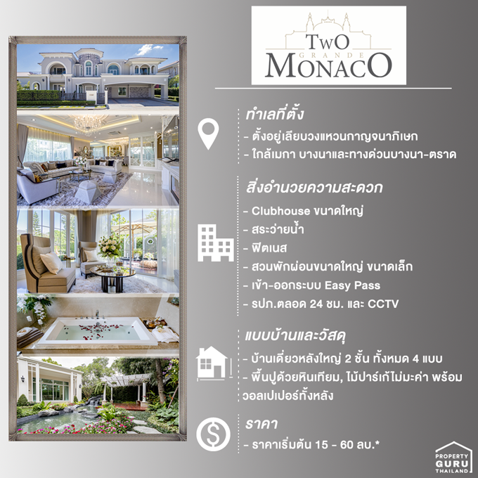 ทู แกรนด์ โมนาโค บางนา - วงแหวน (Two Grande Monaco Bangna - Wongwaen) เรียกได้ว่าเป็นคฤหาสน์หรู สไตล์ Monaco ย่านบางนา ที่ตอบโจทย์การใช้งานในทุกฟังก์ชัน พร้อม Clubhouse ขนาดใหญ่ สระว่ายน้ำ และฟิตเนส สวนพักผ่อนขนาดใหญ่ ขนาดเล็ก และใกล้ห้างสรรพสินค้าอย่าง เมกา บางนา และอิเกีย ในราคาเริ่ม 15-60 ล้านบาท ใครสนใจบ้านสร้างเสร็จพร้อมขาย พร้อมเข้าอยู่ได้เลย ไปชมรายละเอียดกันเลยค่ะ
