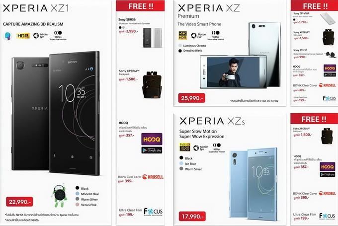 - Sony Xperia XZs ราคา 17,990 บาท แถมฟรี Sony Xperia Backpack ราคา 1,500 บาท, ดูหนังฟรี 3 เดือนจาก HOOQ ราคา 357 บาท, เคสจาก Krusell ราคา 395 บาท, ฟิล์มกันรอย Focus ราคา 199 บาท มูลค่าของแถมรวม 2,451 บาท