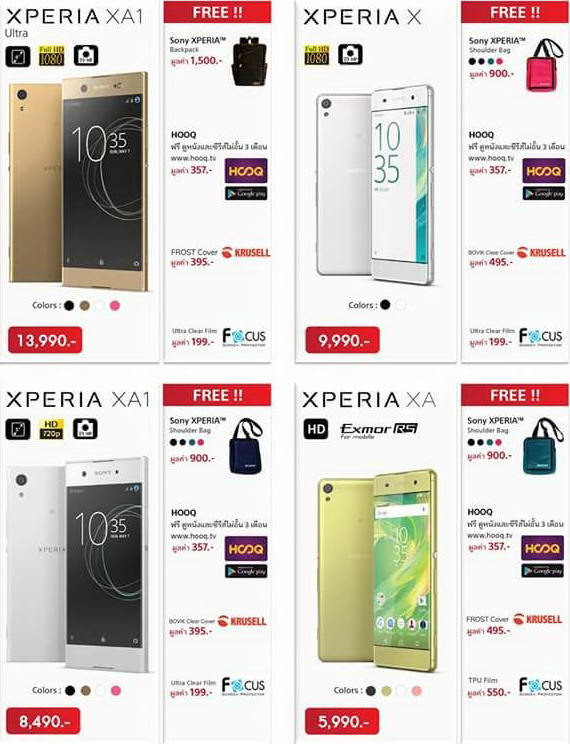 - Sony Xperia XA1 Ultra ราคา 13,990 บาท แถมฟรี Sony Xperia Backpack ราคา 1,500 บาท, ดูหนังฟรี 3 เดือนจาก HOOQ ราคา 357 บาท, เคสจาก Krusell ราคา 395 บาท, ฟิล์มกันรอย Focus ราคา 199 บาท มูลค่าของแถมรวม 2,451 บาท