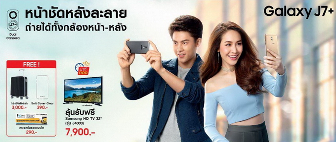 Samsung Galaxy J7+ สมาร์ทโฟนกล้องคู่ราคาสุดคุ้ม ชูจุดเด่นถ่ายรูปสวยในแบบหน้าชัดหลังละลาย ได้ทั้งกล้องหลังและกล้องหน้า ดึงพรีเซ็นเตอร์ซุปตาร์ตัวแทนคนรุ่นใหม่ หมาก-ปริญ และ มิน-พีชญา มุ่งสร้างการรับรู้ในตลาดระดับกลาง เน้นเจาะกลุ่มมิลเลนเนียลผู้รักการถ่ายภาพ