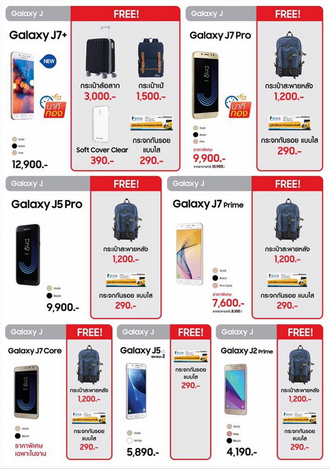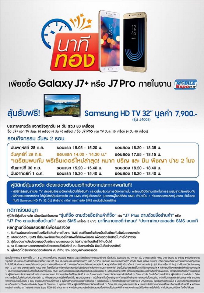 และพิเศษสำหรับ Galaxy J7+ และ Galaxy J7 Pro เมื่อซื้อภายในงาน ลุ้นรับ Samsung HD TV 32 นิ้ว แจกทุกวันรวม 80 เครื่อง