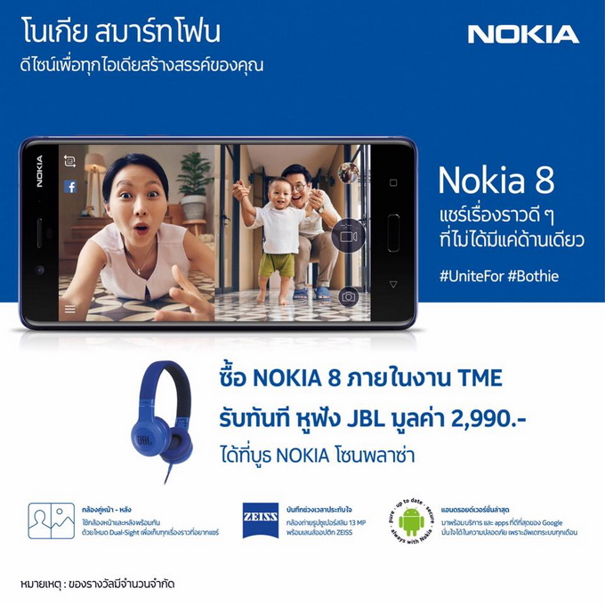 พบกับโปรโมชั่น และกิจกรรมมากมายกับสมาร์ทโฟน Nokia ระบบ Android สมบูรณ์แบบ โดยยกกันมาทั้งกองทัพทั้ง Nokia 3, Nokia 5, Nokia 6 และรุ่นเรือธงสเปคสุดแรง Nokia 8 พร้อมรับฟรีทันทีหูฟัง JBL มูลค่า 2,990 บาท