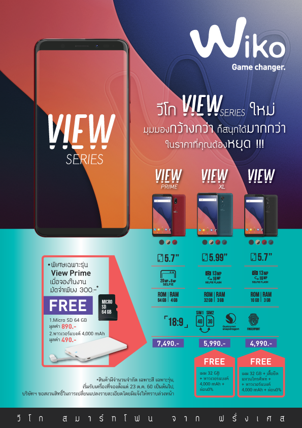 - Wiko View XL ราคา 5,990 บาท ภายในงานนี้ รับฟรี Micro SD card 32 GB + Power bank 4000 mAh
