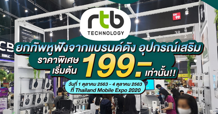 บริษัท อาร์ทีบี เทคโนโลยี จำกัด ผู้นำเข้าและจัดจำหน่ายสินค้า Gadget รายใหญ่ในประเทศไทย ขนหูฟังและอุปกรณ์เสริมจากแบรนด์ดังมาจำหน่ายในงานมหกรรมโทรศัพท์มือถือ Thailand Mobile Expo 2020 ระหว่างวันที่ 1 - 4 ตุลาคม 2563 นี้ พร้อมโปรโมชั่นแรงพร้อมของสมนาคุณอีกมากมาย ในงานจะได้พบกับสินค้าใหม่ และสินค้าราคาพิเศษจากแบรนด์ต่างๆ มากมายที่ RTB Technology นำมาร่วมจัดรายการ อาทิ
