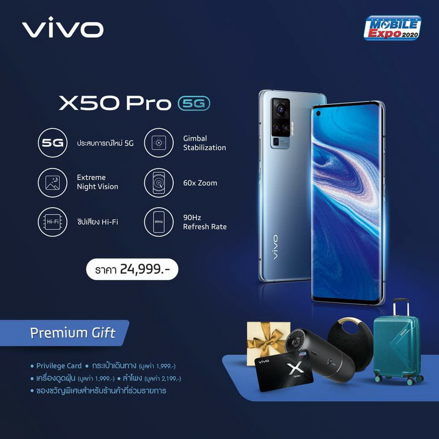 Vivo X50 Pro 5G สมาร์ทโฟนที่มาพร้อมหน้าจอคุณภาพสูง หน้าจอโค้ง Super AMOLED ขนาด 6.56 นิ้ว ความละเอียด Full HD+ 1080 x 2376 pixels (398 ppi), HDR10+, Refresh Rate 90Hz และ Response Rate 180Hz กล้องกันสั่นระบบ Gimbal รุ่นแรกของโลก มาพร้อมกล้อง Periscope Telephoto ที่รองรับการซูมสูงสุดถึง 60x ที่บาง และเบาอย่างน่าทึ่ง มีความบางเพียง 8 มม. เท่านั้น และมีน้ำหนักเพียงแค่ 181.5 กรัม ชิปเซ็ต Qualcomm Snapdragon 765G, RAM 8GB (LPDDR4X), ROM 256GB (UFS 2.1), ชิปเสียง Hi-Fi AK4377A, แบตเตอรี่ความจุ 4,315 mAh รองรับชาร์จเร็ว 33W Vivo FlashCharge 2.0