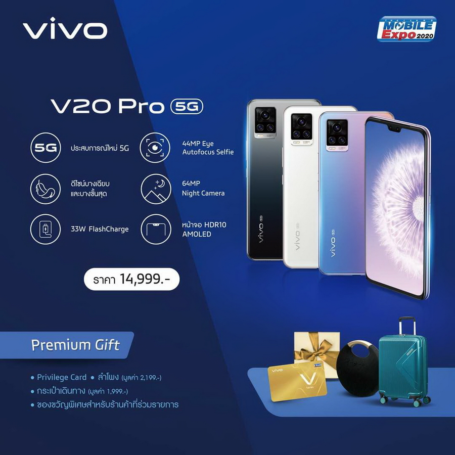 Vivo V20 Pro 5G สมาร์ทโฟน 5G บางที่สุดในโลกเพียงแค่ 7.39 มม. กล้องหน้า 44MP + 8MP Eye Autofocus กล้องหลัง 3 เลนส์ 64MP + 8MP + 2MP ชิปเซ็ต Qualcomm Snapdragon 765G, RAM 8GB (LPDDR4X), ROM 128GB (UFS 2.1), แบตเตอรี่ความจุ 4,000 mAh รองรับชาร์จเร็ว 33W Vivo FlashCharge 2.0