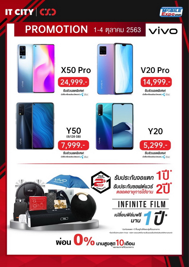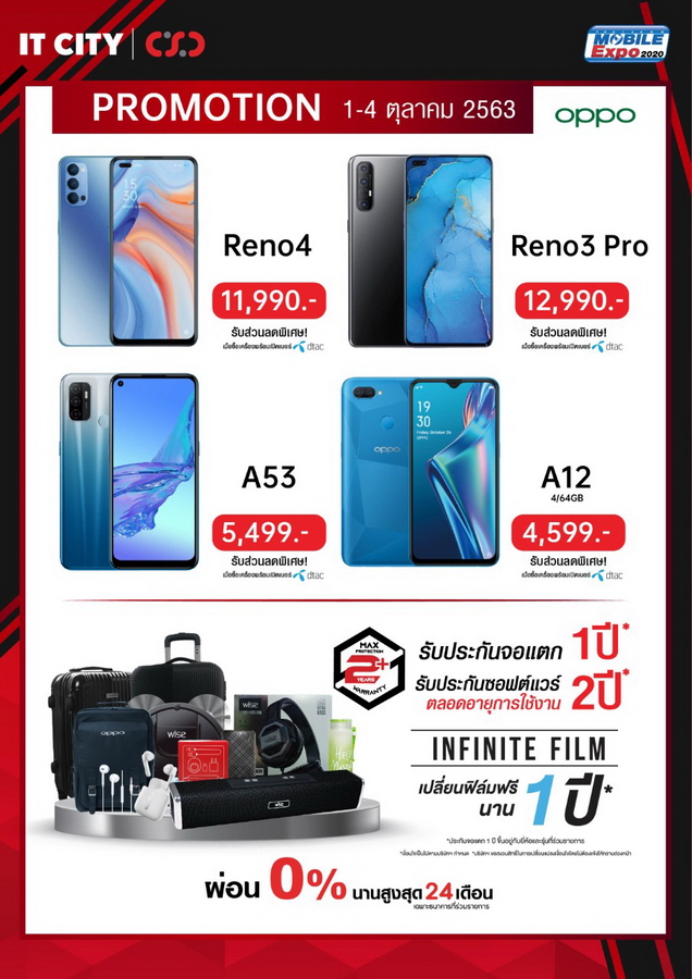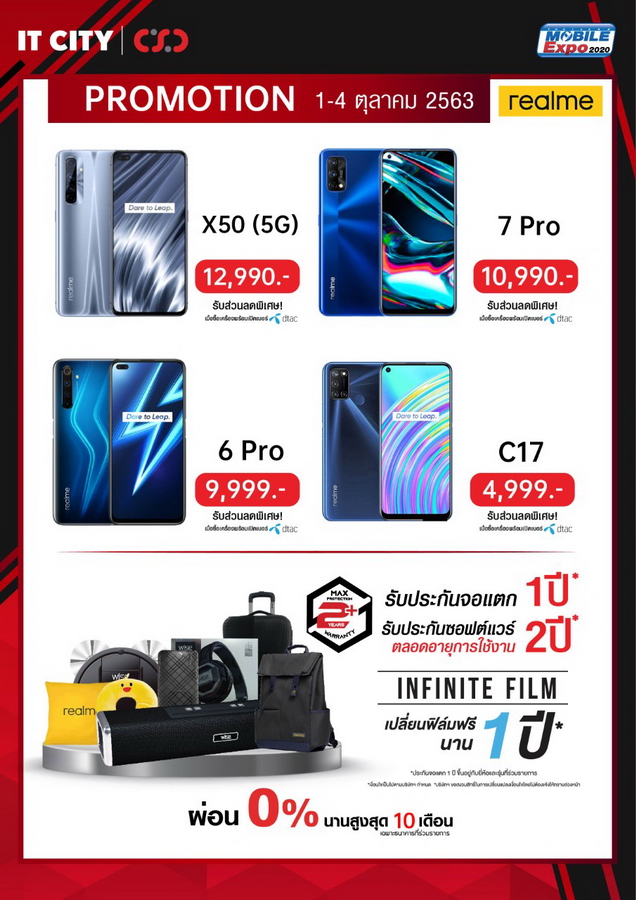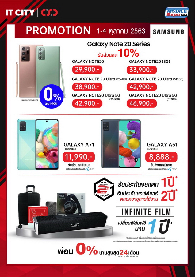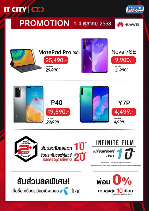 CSC และ IT CITY จัดกระหน่ำรับส่วนลดค่าเครื่องจาก dtac ภายในงาน Thailand Mobile Expo 2020 มีขึ้นระหว่างวันที่ 1 - 4 ตุลาคม 2563 ที่ไบเทค บางนา เดินทางสะดวกด้วยรถไฟฟ้า BTS สถานีบางนา พบกับของสมนาคุณสุดพิเศษภายในงาน แคมเปญดูแลมือถือที่คุณรักอย่าง MAX PROTECTION PLUS ประกัน 2 ปี ที่เหนือกว่า กับแบรนด์ดังอย่าง Samsung, OPPO, Vivo, Huawei และ realme ด้วยดูแลซอฟต์แวร์ฟรีตลอดอายุการใช้งาน รับเพิ่มประกันตัวเครื่อง 2 ปีกันไปเลยแบบไร้กังวล มาตรฐานของการซ่อมอย่างดีจากศูนย์บริการของแบรนด์โดยตรง ไม่ต้องรอเครื่องซ่อมนาน ติดตามงานได้ไม่ยุ่งยาก ยังไม่พอ หากเครื่องมีปัญหา เปลี่ยนเครื่องใหม่ภายใน 30 วัน พร้อมประกันหน้าจอแตกนานสูงสุดถึง 1 ปีไม่มีเงื่อนไขที่ยุ่งยาก