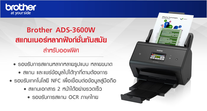 สแกนเนอร์สุดเจ๋งสำหรับออฟฟิศมือโปร! Brother ADS-3600W นอกจากในปี 2559 นี้ Brother จะทำการเปิดตัว "เครื่องพิมพ์สำนักงาน" ที่เปี่ยมไปด้วยประสิทธิภาพพร้อมกันถึง 6 รุ่นแล้ว "ตลาดสแกนเนอร์สำหรับออฟฟิศ" ก็เป็นอีกกลุ่มเป้าหมายที่สำคัญของบราเดอร์ โดยล่าสุดได้มีการออกผลิตภัณฑ์ในกลุ่มสแกนเนอร์มาถึง 3 รุ่น ด้วยกัน คือ Brother ADS-2400N , Brother ADS-2800W รวมถึง Brother ADS-3600W ซึ่งเป็นรุ่นที่เรากล่าวถึงในบทความนี้ โดยเครื่องมาพร้อมคุณสมบัติในการสแกนพร้อมกัน 2 หน้าได้รวดเร็วถึง 100 หน้าต่อนาที รองรับการเชื่อมต่อเครือข่ายเพื่อส่งไฟล์ที่สแกนแล้วทั้งในแบบใช้สายและไร้สาย นอกจากนั้น ยังมีไฮไลท์เด่นอีกมากมาย ดังต่อไปนี้...