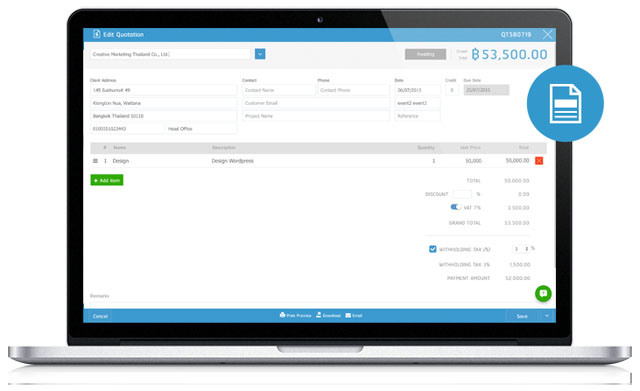 แอปพลิเคชั่น FlowAccount ช่วยให้คุณสามารถเปิดเอกสารใบเสนอราคา ใบวางบิล ใบกำกับภาษี ใบหัก ณ ที่จ่าย และใบสั่งซื้อได้อย่างรวดเร็ว แถมยังถูกต้องตามมาตรฐาน ช่วยบริหารจัดการงานเอกสารที่ยุ่งยากให้เป็นเรื่องง่าย อีกทั้งยังมีระบบสถานะบริหารยอดค้างชำระ ให้คุณเก็บเงินได้ตามเวลาที่กำหนดด้วย