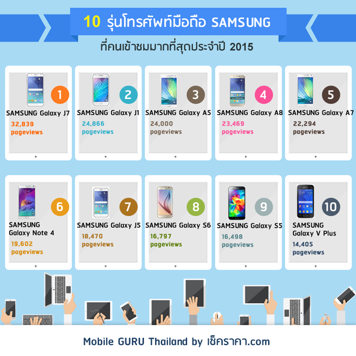 เผลอแปบๆ ก็จะสิ้นปี 2558 กันซะแล้ว และปี 2559 ก็กำลังจะมาถึงในไม่ช้า วันนี้ทาง Checkraka.com เลยจะขอส่งท้ายปี 2558 ด้วยการเปิดเผยตัวเลขจำนวนผู้เข้าชมโทรศัพท์มือถือ 10 รุ่นของ Samsung ตลอดปี 2558 ที่ผ่านมาเพื่อดูว่าผู้ชมนั้นค้นหา และเข้าชมข้อมูลโทรศัพท์มือถือรุ่นไหนของ Samsung มากที่สุดเป็น 10 อันดับแรก ซึ่งตัวเลขเหล่านี้ก็น่าจะพอใช้เป็น Guideline บอกเป็นแนวทางได้ว่าโทรศัพท์มือถือ 10 รุ่นของ Samsung ที่คนสนใจกันมากที่สุด ซึ่งตัวเลขนี้เป็นสถิติทาง Checkraka เอง โดยเป็นข้อมูลล่าสุด ณ วันที่ 8 ธันวาคม 2558 เรามาดูกันเลยค่ะว่า โทรศัพท์มือถือ 10 รุ่นของ Samsung ที่มีคนเข้าชมมากสุด มีรุ่นไหนกันบ้าง