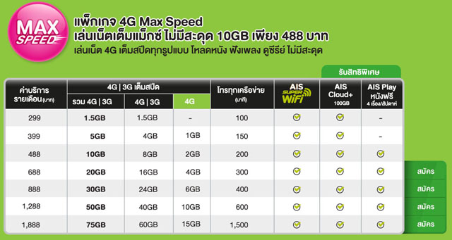1. 4G Max Speed มีราคาตั้งแต่ 299 บาท จนถึง 1,888 บาทต่อเดือน โดยราคาที่ทาง AIS ชูว่าคุ้มค่าที่สุดเมื่อเทียบกับเงินที่จ่ายไปไม่นัก ก็คือ 488 บาทต่อเดือน ซึ่งผู้ใช้จะได้รับอินเทอร์เน็ต 4G / 3G รวมกันถึง 10GB โทรฟรีทุกเครือข่าย 200 นาที ใช้ AIS SUPER WiFi ฟรี ได้รับพื้นที่ AIS Cloud+ จำนวน 100GB และดูหนังฟรี 4 เรื่องต่อสัปดาห์ ผ่าน AIS Play