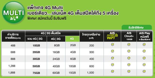 2. 4G Multi เป็นแพ็กเกจที่เน้นการใช้เบอร์โทรศัพท์เบอร์เดียว แต่สามารถนำไปใช้ได้ถึง 5 เครื่อง เหมาะกับพวกที่นำไปใช้กับแท็บเล็ตเป็นต้น โดยมีค่าบริการรายเดือนตั้งแต่ 488 บาท จนถึง 1,888 บาท