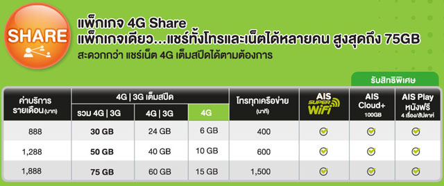 3. 4G Share เป็นแพ็กเกจเดียวที่สามารถแชร์ทั้งโทรและเน็ตได้มากถึง 5 เบอร์ และสูงสุดถึง 75GB เลยทีเดียว โดยมีค่าบริการรายเดือนให้เลือกตั้งแต่ 888 บาท จนถึง 1,888 บาท
