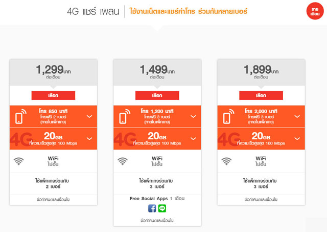 3. 4G แชร์ แพลน เน้นใช้งานเน็ต และค่าโทรร่วมกันหลายเบอร์ โดยมีค่าบริการให้เลือกตั้งแต่ 1,299 บาท จนถึง 1,899 บาท ใช้เน็ตได้สูงสุด 20GB และแชร์ร่วมกันได้สูงสุด 3 เบอร์