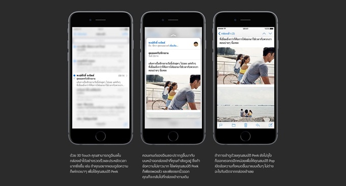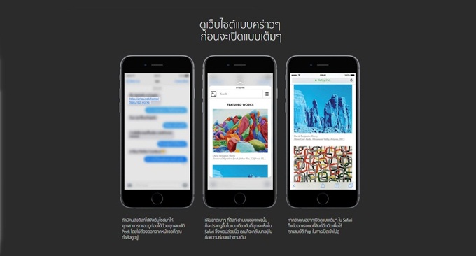 หรือมีคนส่งลิ้งค์เว็บไซต์มาให้ เพียงแค่กดแบบ Peek ที่ลิ้งค์นั้น เราก็จะสามารถเห็นเว็บไซต์นั้นแบบเดียวกับที่เห็นใน Safari และถ้าเราปล่อยนิ้วก็จะกลับมาอยู่หน้าเดิม หากจะเข้าไปดูแบบเต็มๆก็แค่กดแบบ Pop เท่านั้นเองง่ายใช่ไหมล่ะ นอกจากนั้นยังมีคุณสมบัติแอคชั่นด่วนที่น่าสนใจนั่นก็คือการเข้าแอปฯ แต่ละแอป เราสามารถกดเบาๆ ที่แอปฯ นั้นแล้วจะมีเมนูย่อยเด้งขึ้นมาให้เลือกทันที