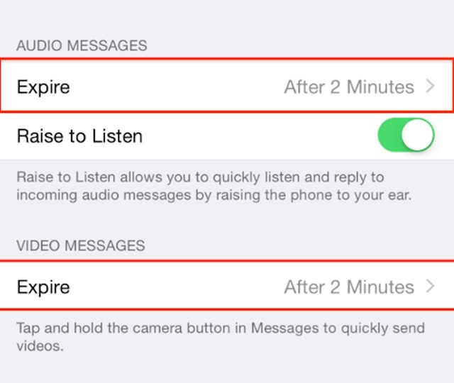 เวลาส่งข้อความที่เป็นวีดีโอหรือข้อความเสียงให้ใครแล้ว สิ่งที่ส่งไปอาจจะเป็นความลับหรือไม่อยากให้ใครมาเห็นจะลบแชทก็ไม่อยากลบ แต่ไม่รู้จะทำไง ขอบอกเลยว่าคุณสามารถกำหนดเวลาหมดอายุให้วีดีโอและข้อความเสียงเหล่านั้นได้ด้วย เพียงข้าไปที่การตั้งค่า หรือ Settings > Messages แล้วเลื่อนลงมาล่างสุดก็จะเจอฟังก์ชั่นที่เรานั้นสามารถกำหนดให้ข้อความเสียงหรือข้อความวิดีโอหมดอายุหลังจากส่งไปแล้ว 2 นาที หรือจะไม่ใช้ฟังก์ชั่นนี้ก็ให้กดที่กรอบสีแดงและเลือก Never ได้เลยค่ะ