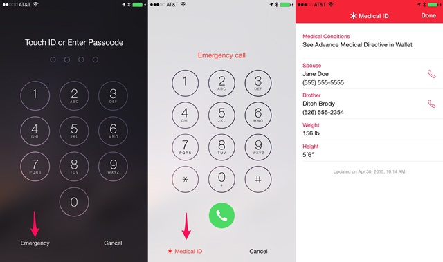 หากคุณกำลังมีเรื่องเร่งด่วนที่จะต้องติดต่อคนสำคัญ แต่...จำเบอร์โทรก็ไม่ได้! ครั้นจะให้กดรหัสปลดล็อคเครื่อง แล้วหาเบอร์ติดต่ออีกก็คงจะช้าไปสำหรับสถานการณ์เร่งด่วน ขอแนะนำฟีเจอร์นี้เลยค่ะ (ใช้ได้ตั้งแต่ iOS 8 ขึ้นไป) สำหรับ iPhone ที่ต้องเข้ารหัส จะมีโหมด Emergency อยู่ที่มุมซ้ายด้านล่างในหน้าที่ใส่รหัส เมื่อกดเข้าไปจะเจอตัวเลือก Medical ID ที่มุมซ้ายด้านล่างซึ่งจะมีข้อมูลของผู้ใช้งานเครื่องเช่น ชื่อ-นามสกุล วันเดือนปีเกิด และเบอร์โทรศัพท์ฉุกเฉินสำหรับโทรติดต่อครอบครัวหรือเพื่อน