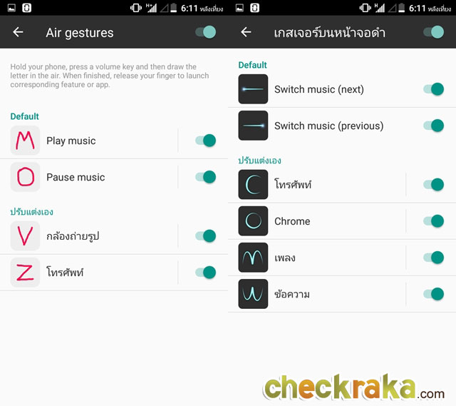 ZTE Blade V7 Lite มีฟีเจอร์ที่เรียกว่า Gesture & Motion Control คือการสั่งงานด้วยท่าทางอย่างเช่น Air Gestures จะเป็นเมนูลัดเข้าสู่โหมดต่างๆ คือเมื่อเราอยู่ในหน้ารายชื่อโทรศัพท์เกิดอยากฟังเพลงขึ้น ก็แค่กดปุ่มตรงปุ่มเพิ่มลดเสียงค้างเอาไว้และวาดโทรศัพท์ให้เป็นรูปตัว M จะเข้าสู่โหมดฟังเพลง หรือถ้าจะหยุดเล่นเพลงก็กดปุ่มเพิ่ม-ลดเสียงค้างไว้ และวาดโทรศัพท์เป็นรูปตัว O เท่านั้น หรือจะเคาะ 2 ครั้งที่หน้าจอเพื่อเป็นการเปิดหน้าจอของตัวเครื่อง หรือคว่ำตัวเครื่องเพื่อปิดเสียงเรียกเข้า