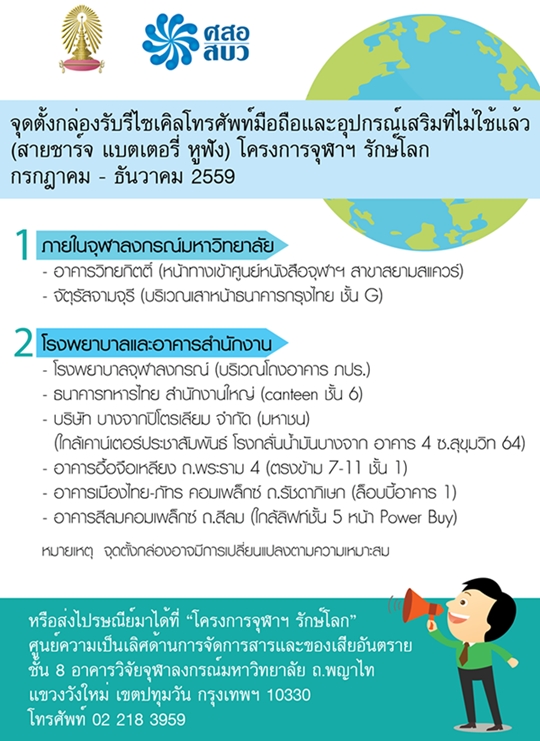 โครงการจุฬาฯ รักษ์โลก (Chula Loves the Earth) นอกจากนี้ หากใครไม่สะดวกก็สามารถส่งโทรศัพท์มือถือ แบตเตอรี่ หรืออุปกรณ์เสริม ผ่านไปรษณีย์ได้ตามที่อยู่นี้ได้เลยค่ะ "โครงการจุฬาฯ รักษ์โลก" ศูนย์ความเป็นเลิศด้านการจัดการสารและของเสียอันตราย ชั้น 8 อาคารวิจัยจุฬาลงกรณ์มหาวิทยาลัย ถนนพญาไท แขวงวังใหม่ เขตปทุมวัน กรุงเทพฯ 10330 โทร. 02-2183959
