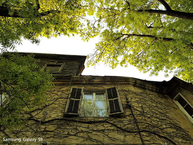 ภาพที่ถ่ายจะเป็นตัวอาคารเก่าแก่ ที่พันไปด้วยเถาวัล ภาพนี้ Samsung Galaxy S8 จับรายละเอียดได้มากกว่า แต่ว่าโทนสีของภาพติดโทนอุ่นมากจนดูไม่ค่อยเป็นธรรมชาติ