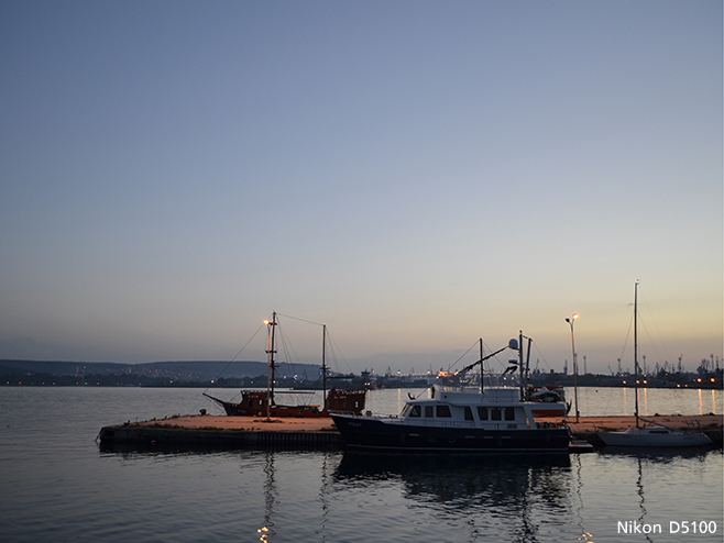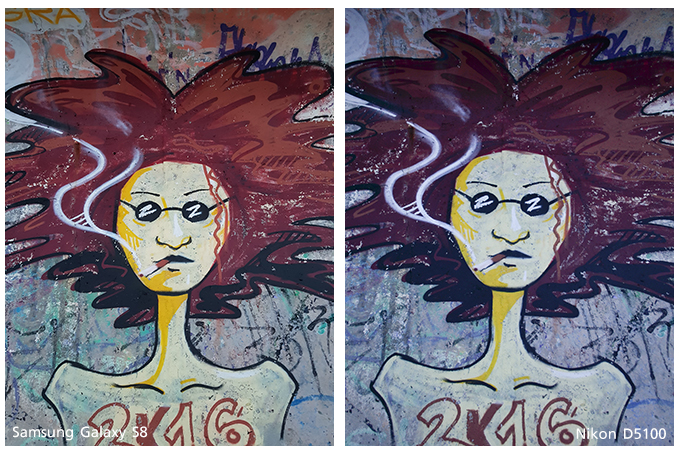 เป็นภาพเปรียบเทียบในสภาวะแสงน้อย โดยภาพนี้ Samsung Galaxy S8 ใช้ ISO 640 และความเร็วชัตเตอร์ 1/10 ส่วน Nikon D5100 ดัน ISO ไปถึง 1,250 จากภาพเนื่องจาก ISO บนภาพของ Galaxy S8 น้อยกว่าภาพจึงไม่มี Noise มารบกวน แต่รายละเอียดของภาพก็สูญเสียไปเยอะ แต่ในเรื่องโทนสียังดูสวยกว่า