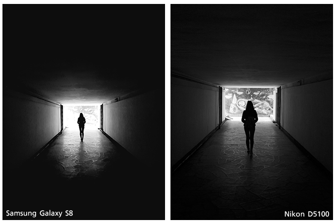 ภาพถ่ายภายในอุโมงค์ไปยังจุดกำเนิดแสง โดย Samsung Galaxy S8 จะถ่ายด้วยโหมด Classic และ Nikon D5100 จะใช้โหมด Night vision สำหรับภาพแนวนี้จะเห็นได้ชัดว่ามันเป็นข้อจำกัดของสมาร์ทโฟน ซึ่ง Nikon D5100 ทำได้ดีกว่าครับ รายละเอียดตรงจุดกำเนิดแสงเก็บได้หมด ส่วน Samsung Galaxy S8 จะไม่สามารถทำได้